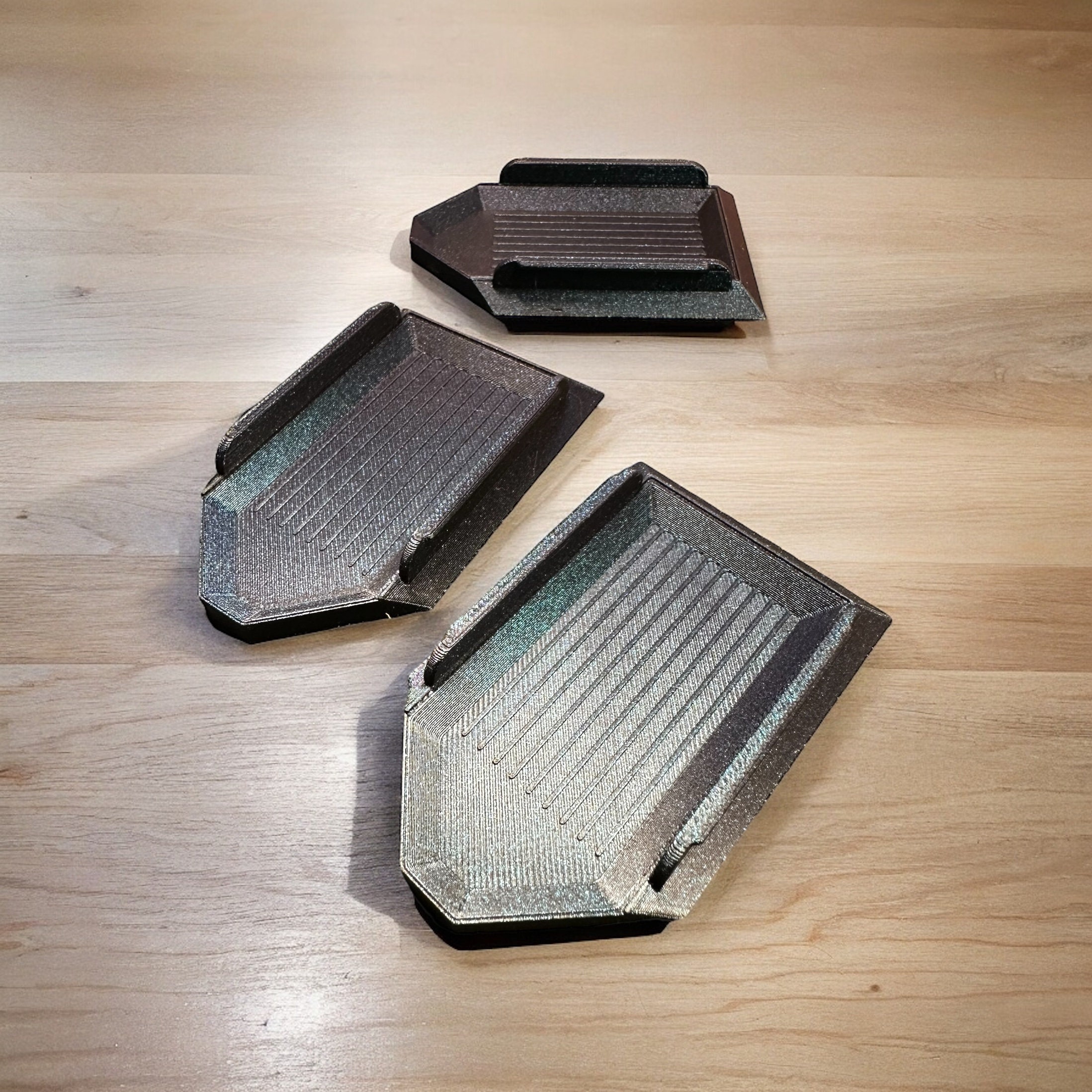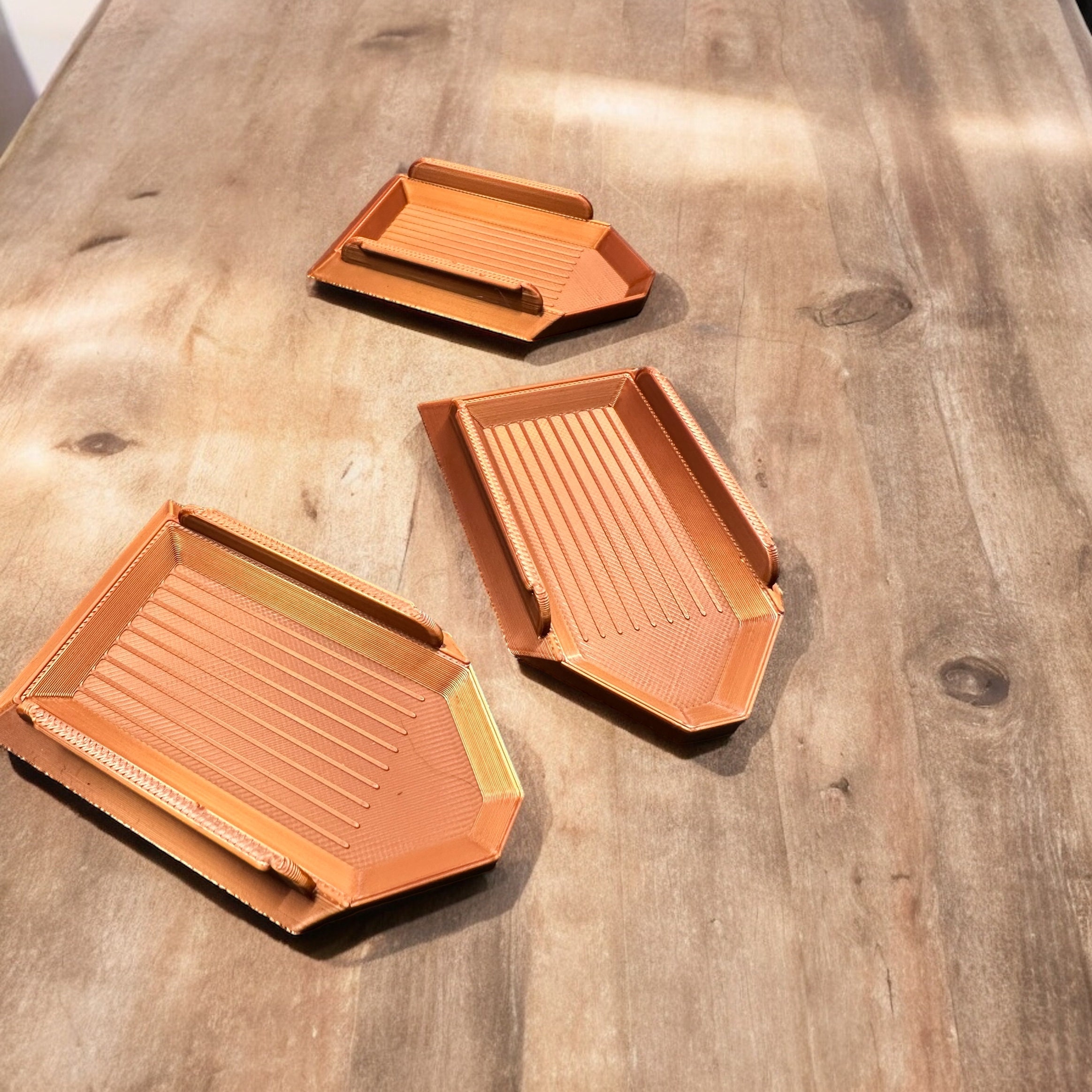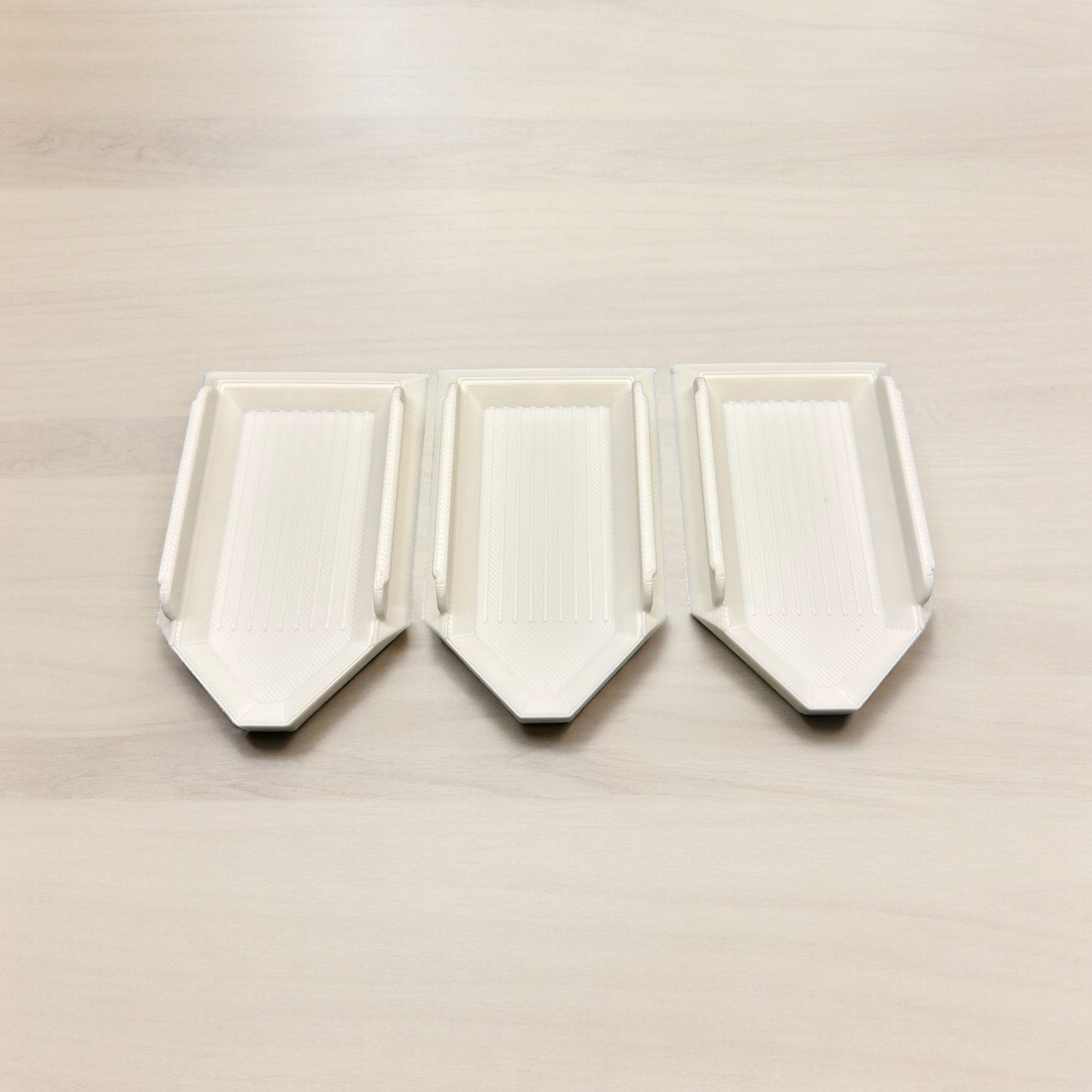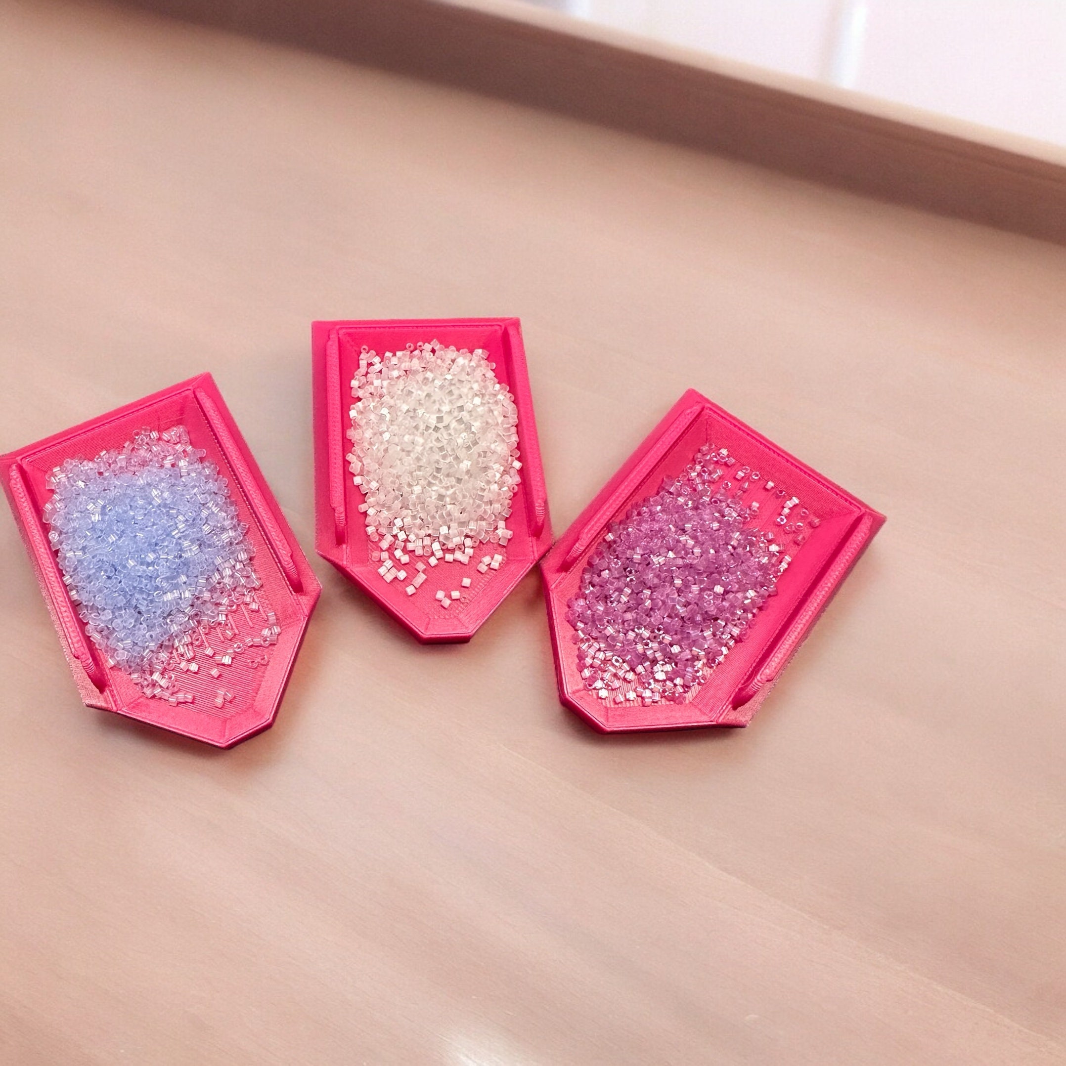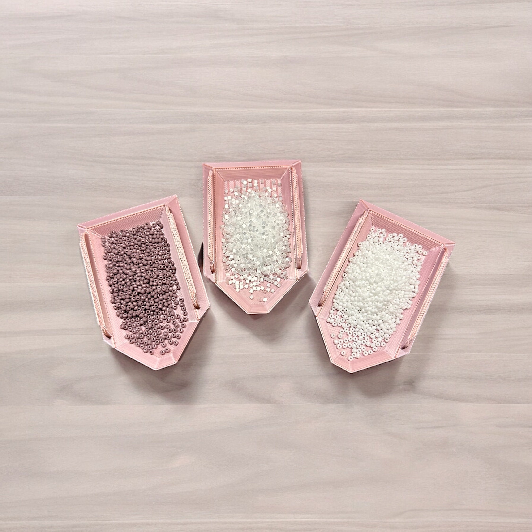 I love these little bead trays! They are made extra wide to prevent tipping and spilling beads, and measure approximately 2" wide and 3" long on the outside. Inside measures 1.1" wide and 2.4" long.